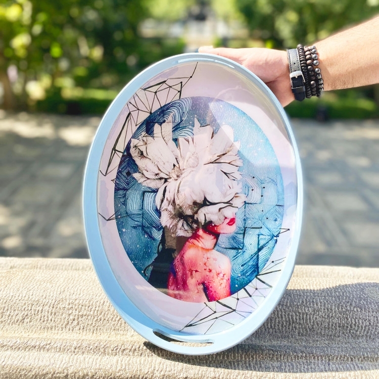 سینی پذیرایی چوبی دستساز گالری عزیزی طرح صورت دختر مدل دیجیتال آرت