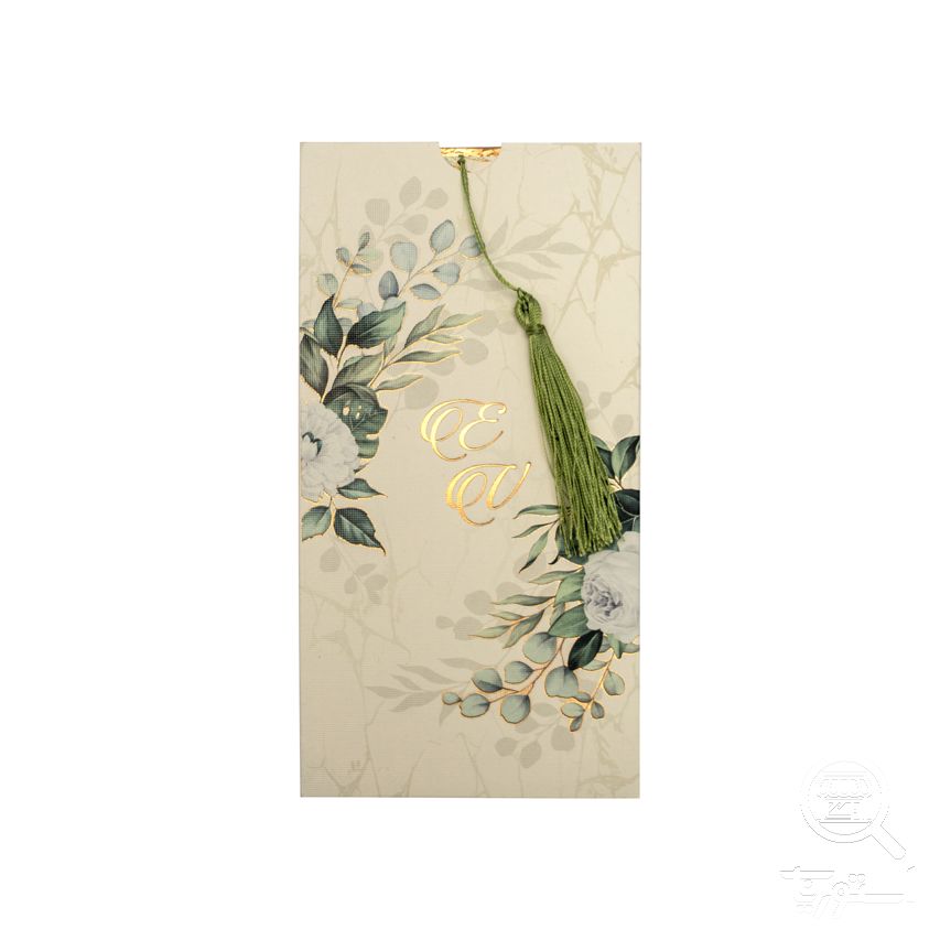 کارت عروسی مستطیل ساده کرم متالایز با پاکت سبز و منگوله 541