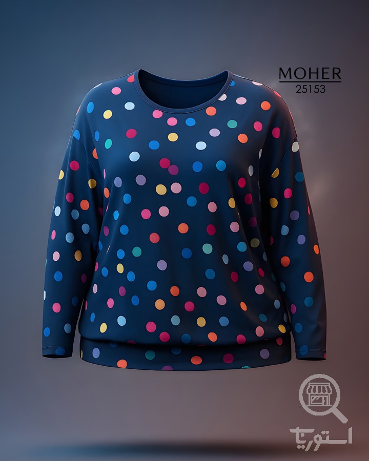 بلوز سایز بزرگ آبی سورمهای با طرح خالخالی رنگی
