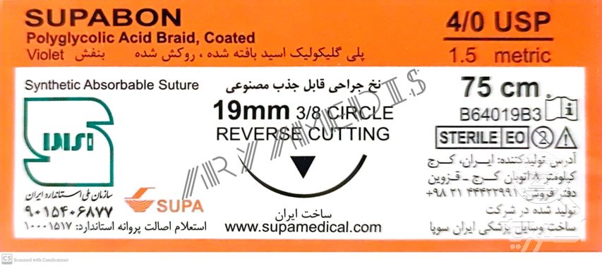 نخ و سوزن ویکریل (سوپابن) 4/0 با کات سوزن 19 (قابل جذب مصنوعی)(بسته 36 عددی)