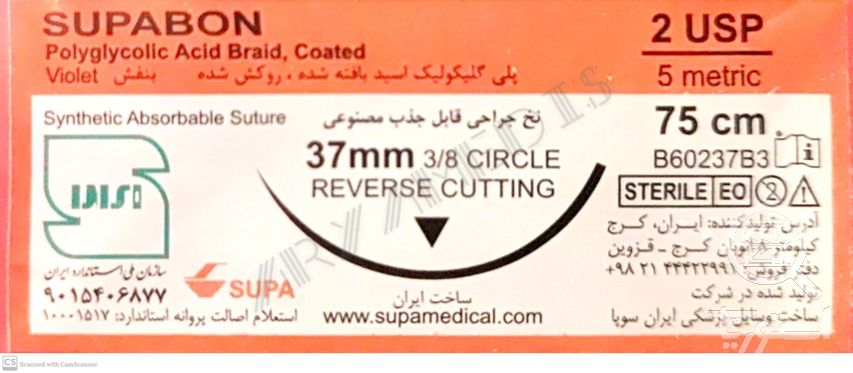 نخ و سوزن جراحی ویکریل (سوپابن) 2 کات سوزن 37 (قابل جذب مصنوعی)(بسته 36 عددی)
