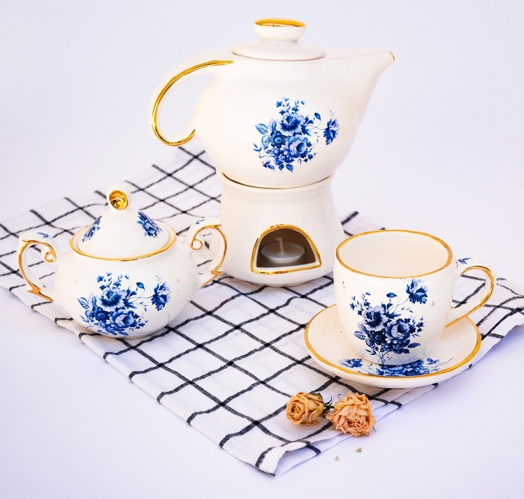 سرویس چایخوری سرامیکی دستساز مهتاب مدل گل های ژاپنی مجموعه ۷ پارچه
