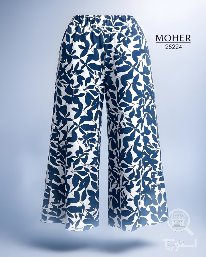 شلوار زنانه سایز بزرگ طرح برگهای آبی سفید