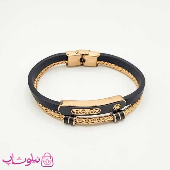 دستبند مردانه چرم و استیل رولکس رزگلد مشکی