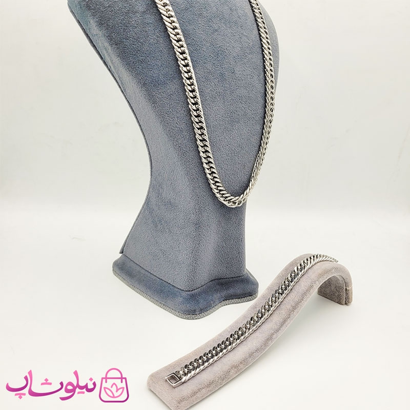 ست گردنبند و دستبند مردانه استیل نقره ای