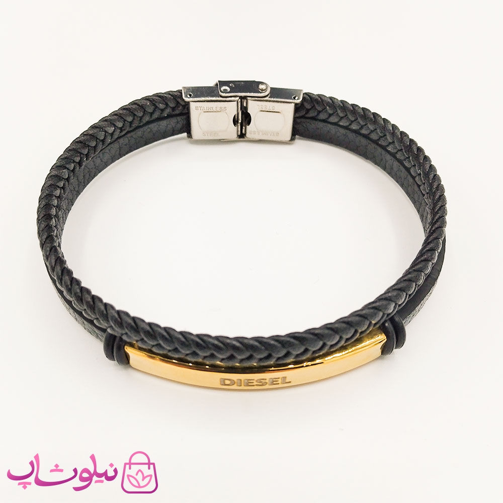 دستبند مردانه چرم و استیل دیزل طلایی مشکی