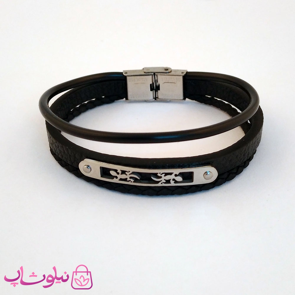 دستبند چرمی و استیل مردانه سه ردیفه کد 391-1