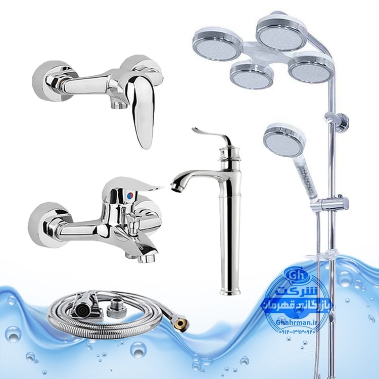 ست ۵ عددی شیرآلات مدل قهرمان | روشویی پایهبلند + توالت + حمام + علم دوش هلی شاتی + شلنگ توالت | کروم براق