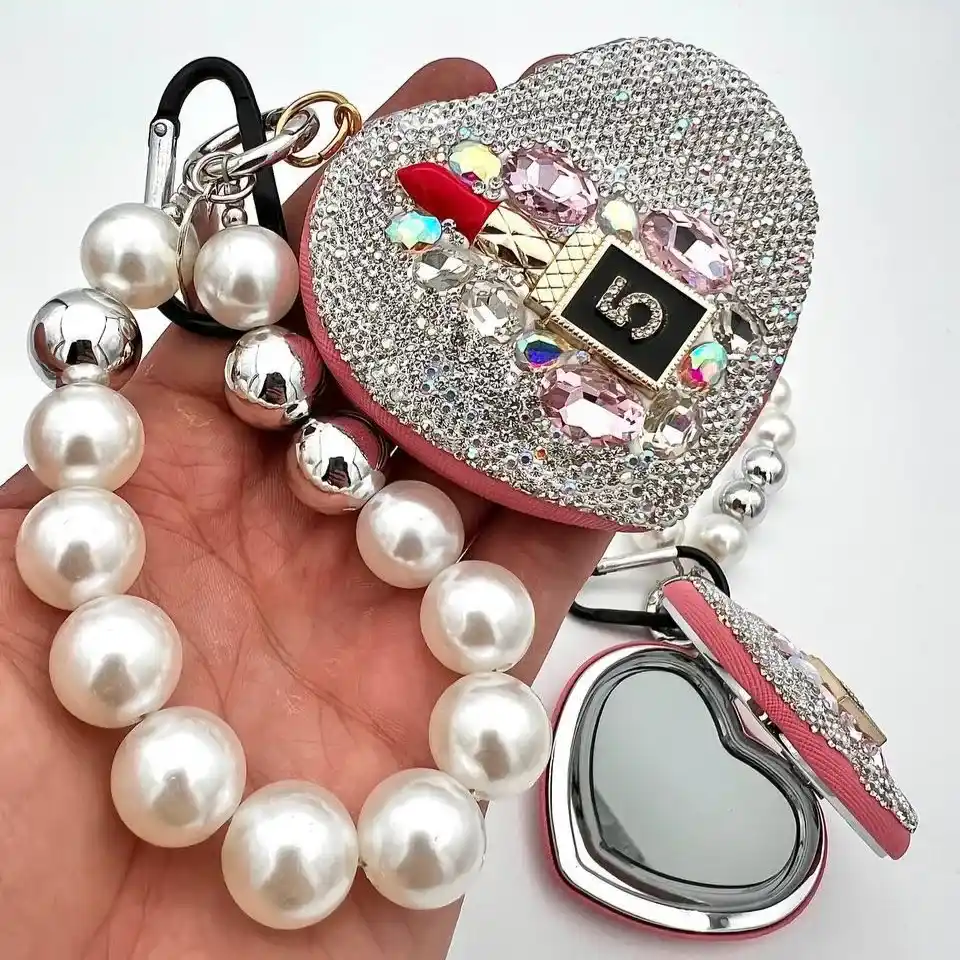 آینه جیبی زنانه آرایشی طرح رژلب بند مرواریدی