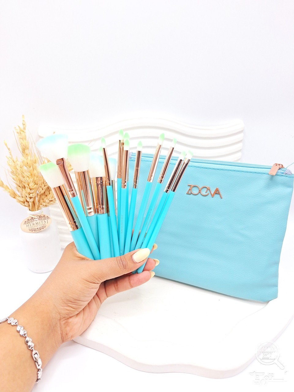 ست براش صورتی اصل 15 عددی لاکچری زووا با کیف چرمی (رنگ آبی روشن)