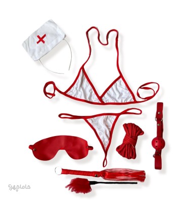 ست کاستوم پرستاری و اکسسوری (شلاق،چشم بند،دهان بند توپی،بندتیگلر،ست پرستاری) کد 509