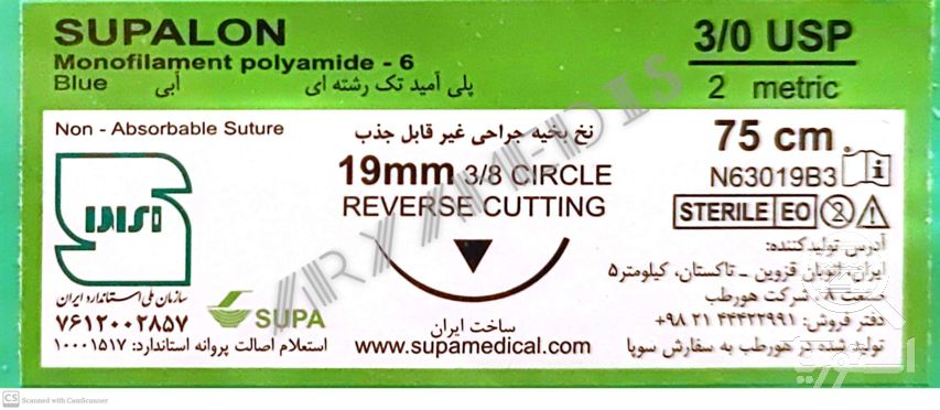 نخ و سوزن جراحی نایلون 3/0 کات سوزن 19 (غیر قابل جذب مصنوعی سوپا)(بسته 36 عددی)