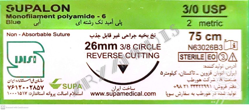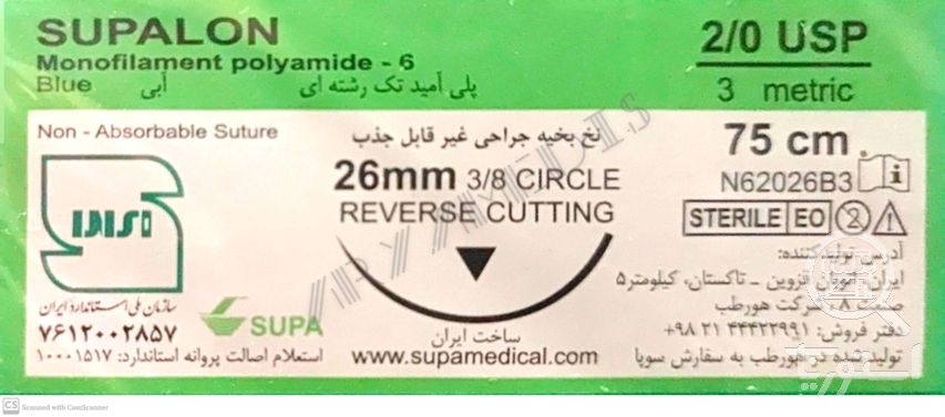 نخ و سوزن جراحی نایلون 2/0 کات سوزن 26 (غیر قابل جذب مصنوعی سوپا)(بسته 36 عددی)