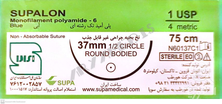 نخ و سوزن جراحی نایلون 1 راند سوزن 37 (غیر قابل جذب مصنوعی سوپا)(بسته 36 عددی)