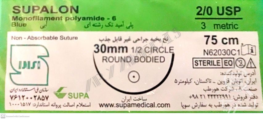 نخ و سوزن جراحی نایلون 2/0 راند سوزن 30 (غیر قابل جذب مصنوعی سوپا)(بسته 36 عددی)