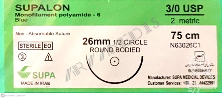 نخ و سوزن جراحی نایلون 3/0 راند سوزن 26 (غیر قابل جذب مصنوعی سوپا)(بسته 36 عددی)