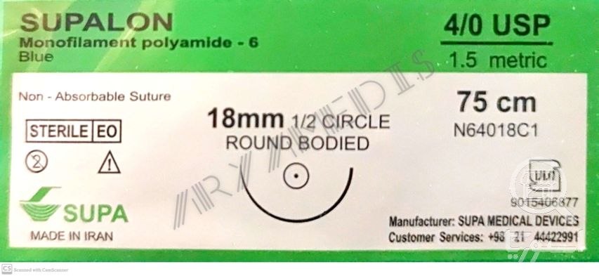 نخ و سوزن جراحی نایلون 4/0 راند سوزن 18 (غیر قابل جذب مصنوعی سوپا)(بسته 36 عددی)
