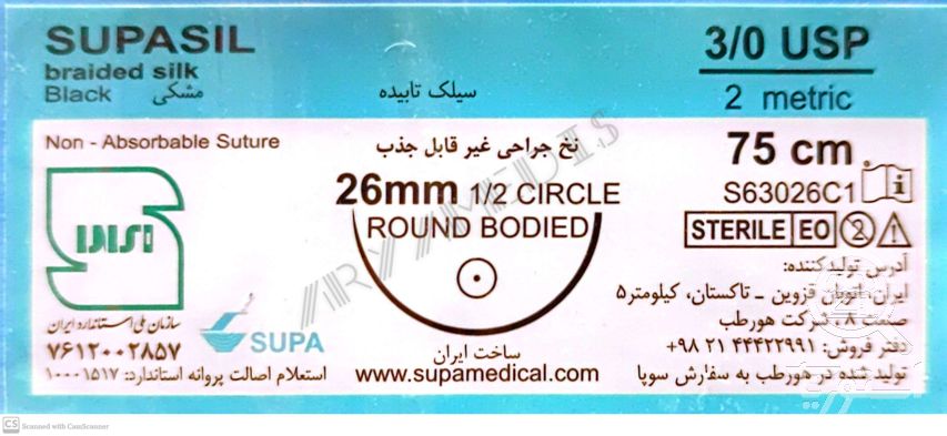 نخ و سوزن جراحی سیلک 2/0 راند سوزن 26 (غیر قابل جذب طبیعی) (سوپا)(بسته 36 عددی)