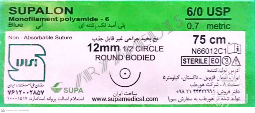 نخ و سوزن جراحی نایلون 6/0 راند سوزن 12 (غیر قابل جذب مصنوعی سوپا)(بسته 36 عددی)