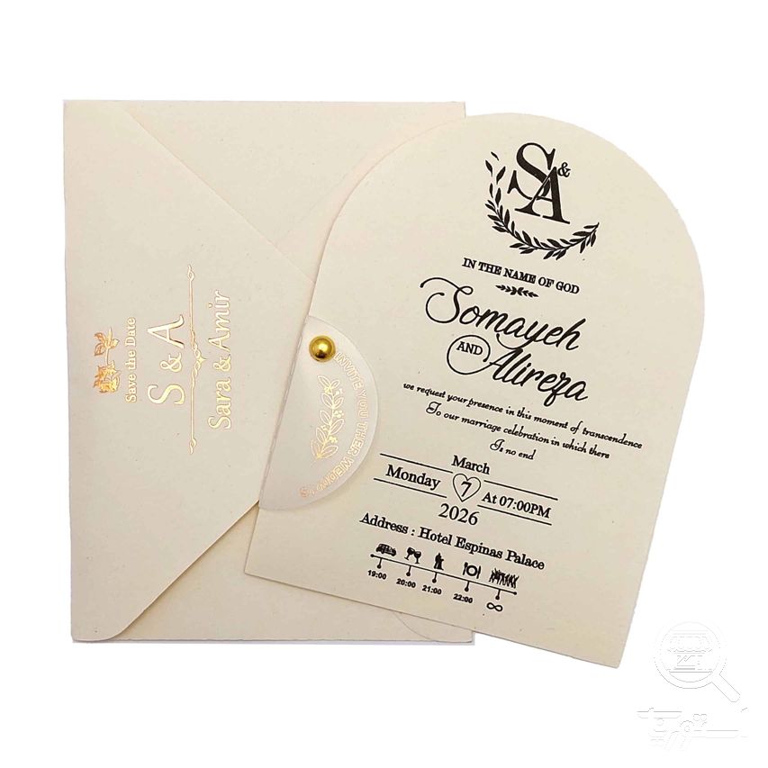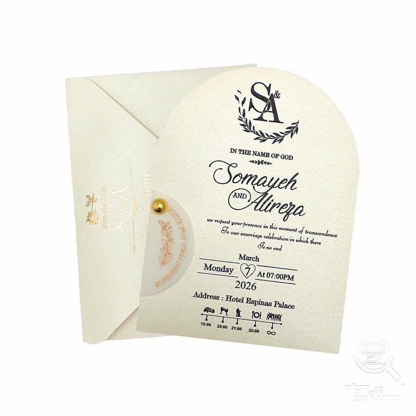 کارت عروسی طاقی با پاکت مقوای کرمی براق طرح برجسته با مدال 452