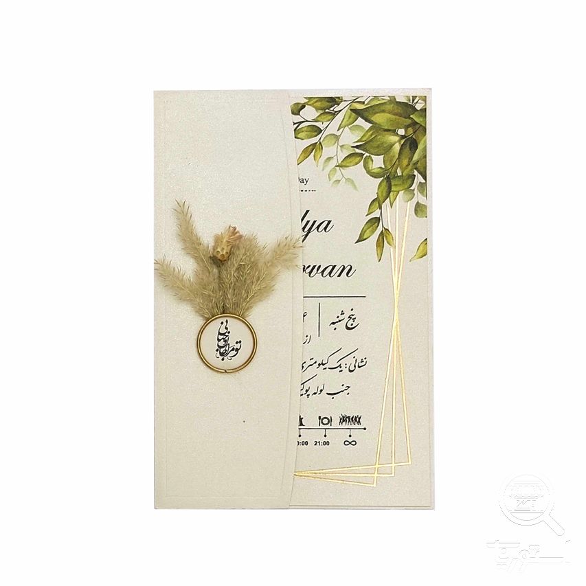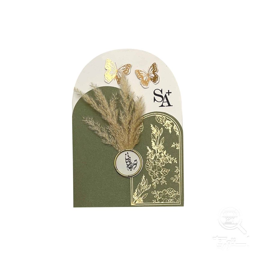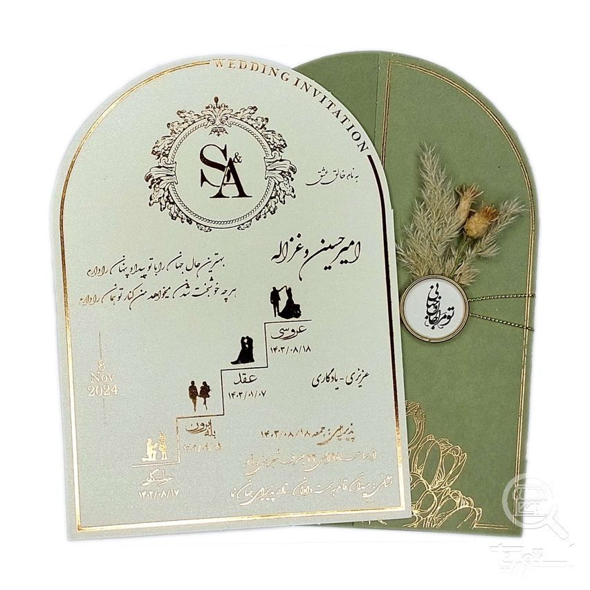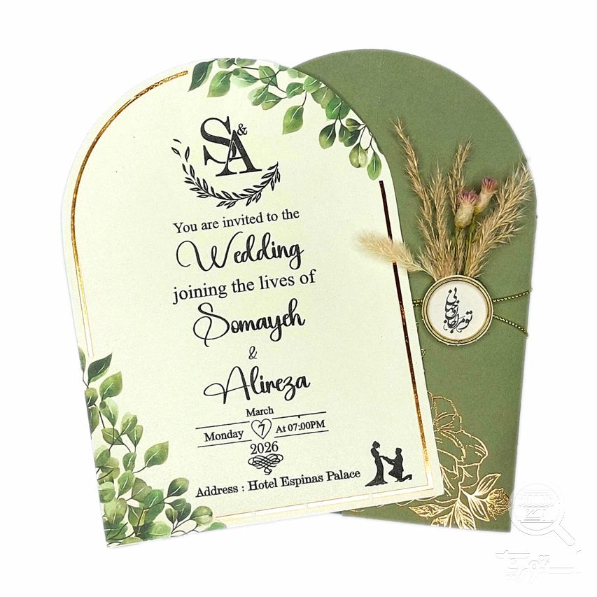 کارت عروسی مقوایی براق با پاکت نیم دایره سبز با مدال و گل خشک 522
