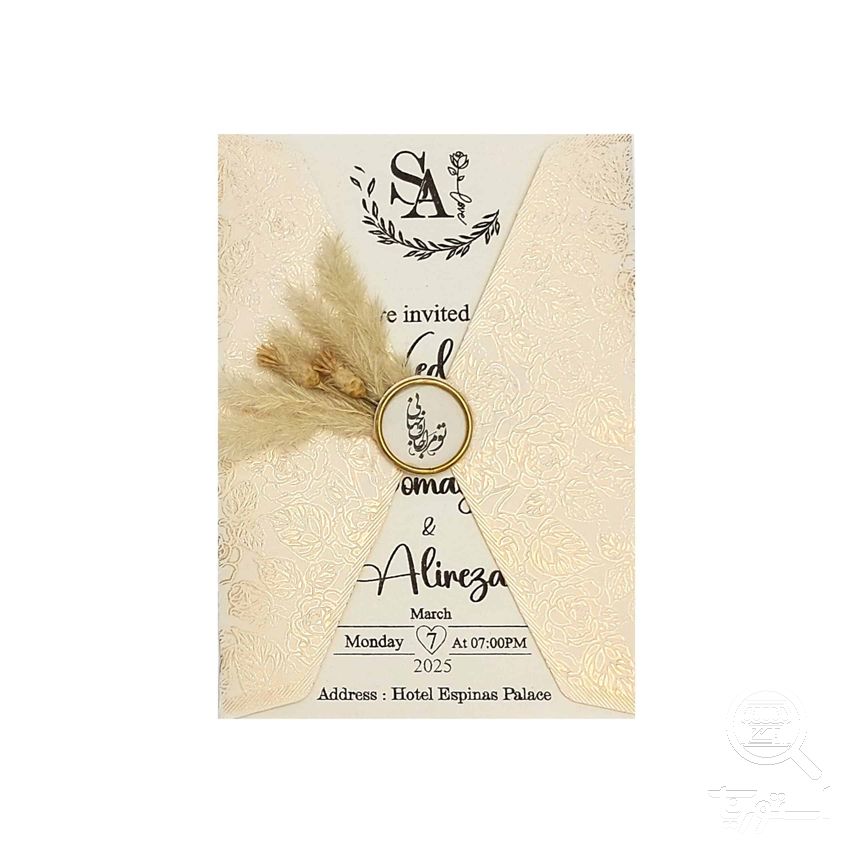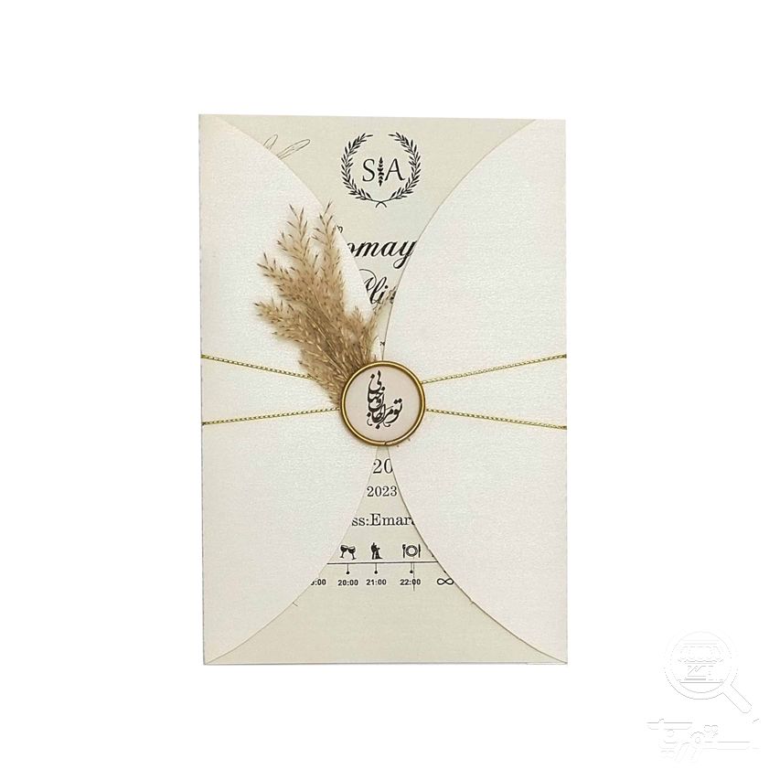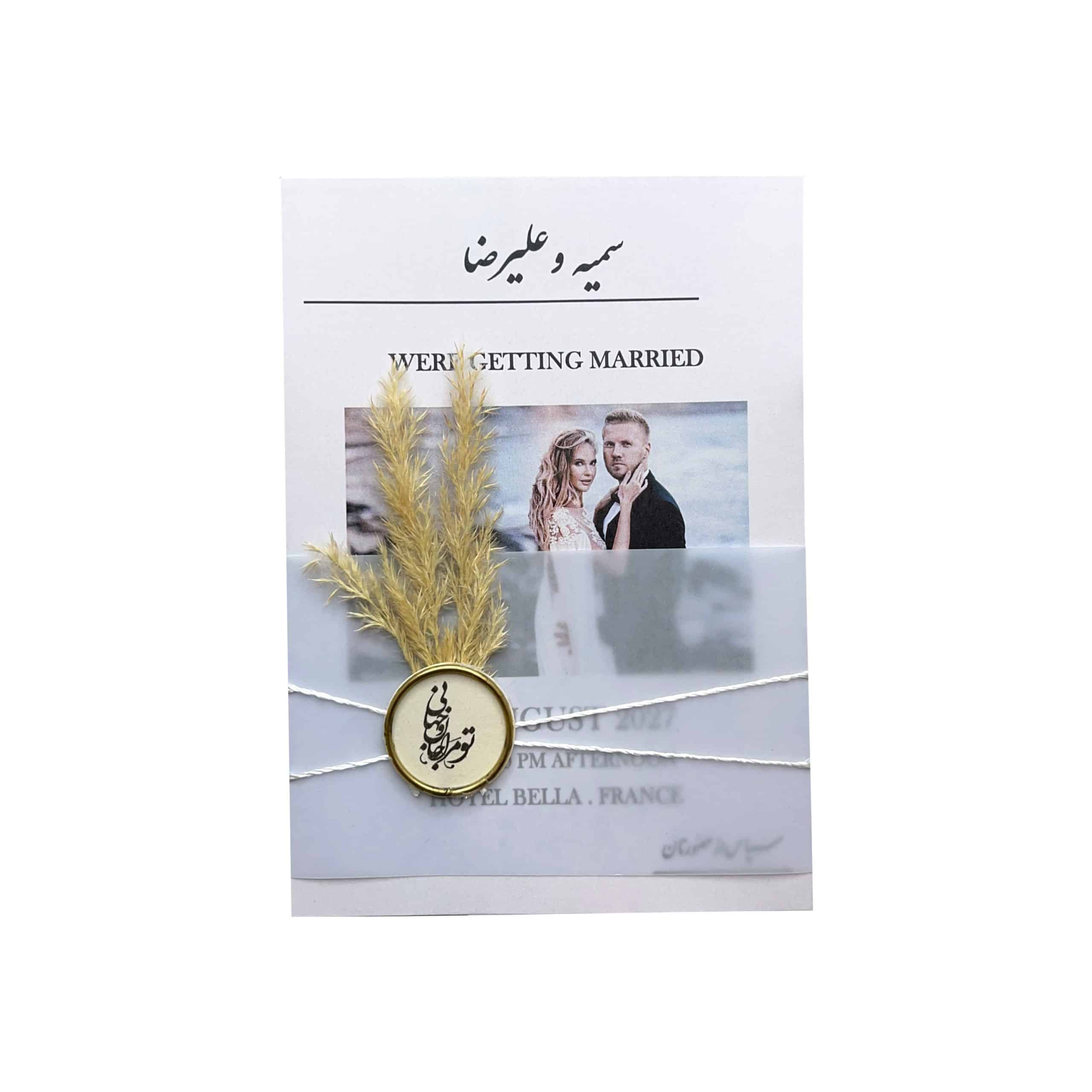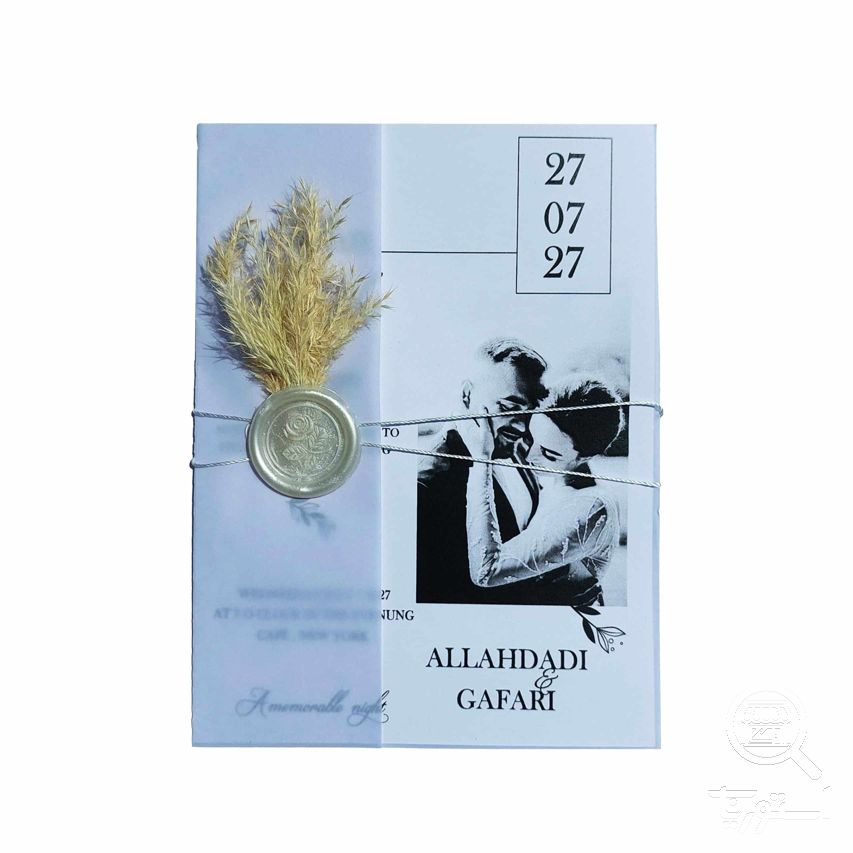 کارت عروسی نیم پاکت کالکی عکسدار با گل خشک و مهر و موم 525