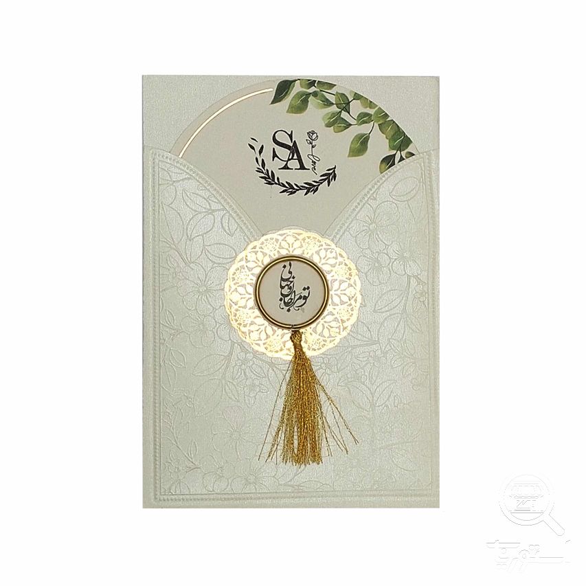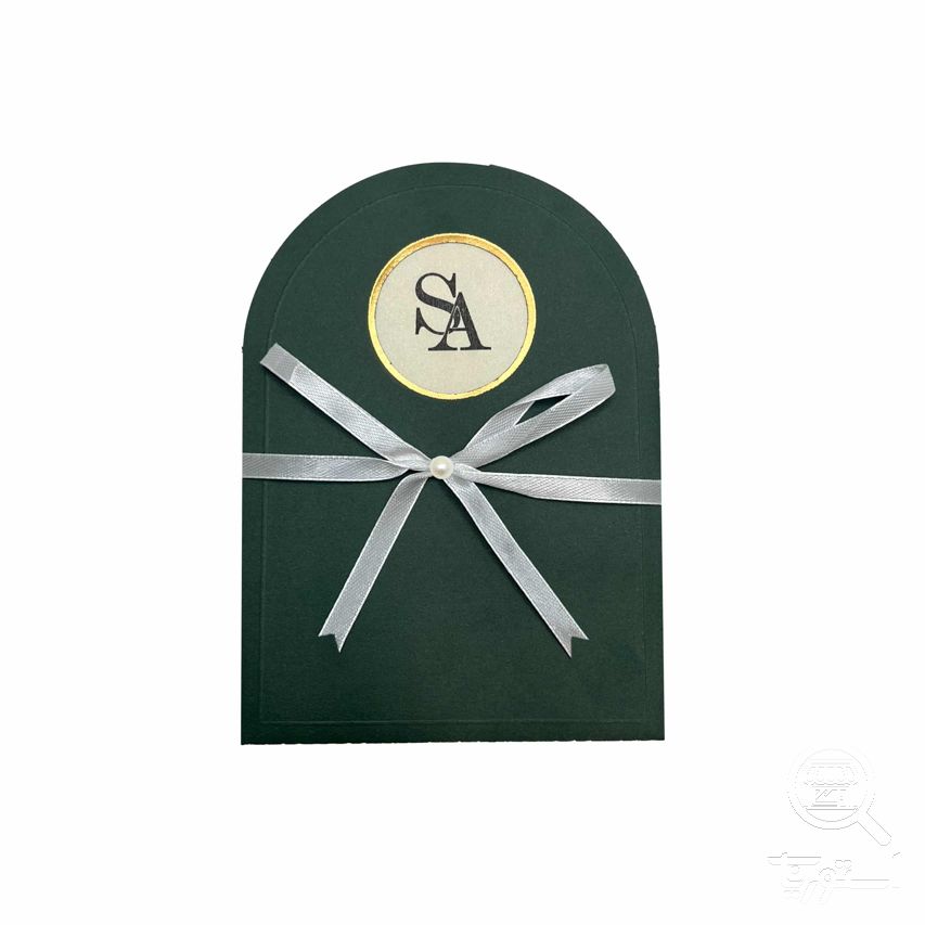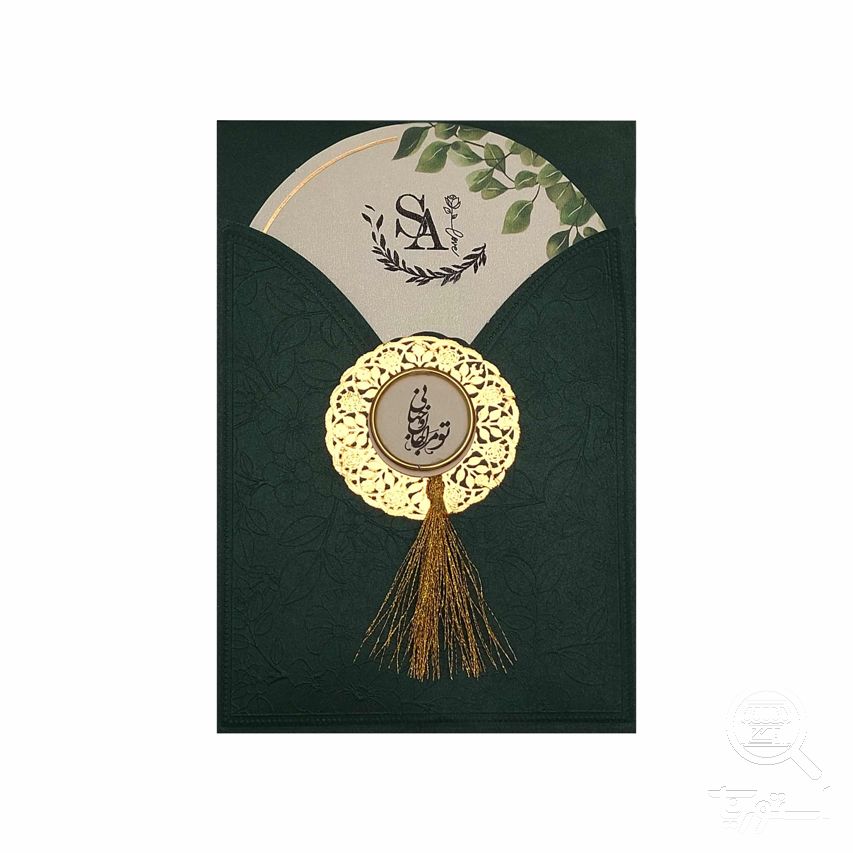 کارت عروسی طاقی با پاکت مقوای سبز طرح برجسته با مدال و منگوله 441