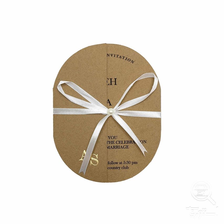 کارت عروسی ساده بیضی شکل نیم باز به رنگ قهوه ای با مقوای بافت دار 551