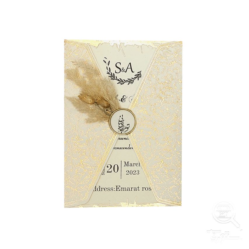 کارت عروسی مقوای کرمی طلایی طرح دار با دکمه و گل خشک 460
