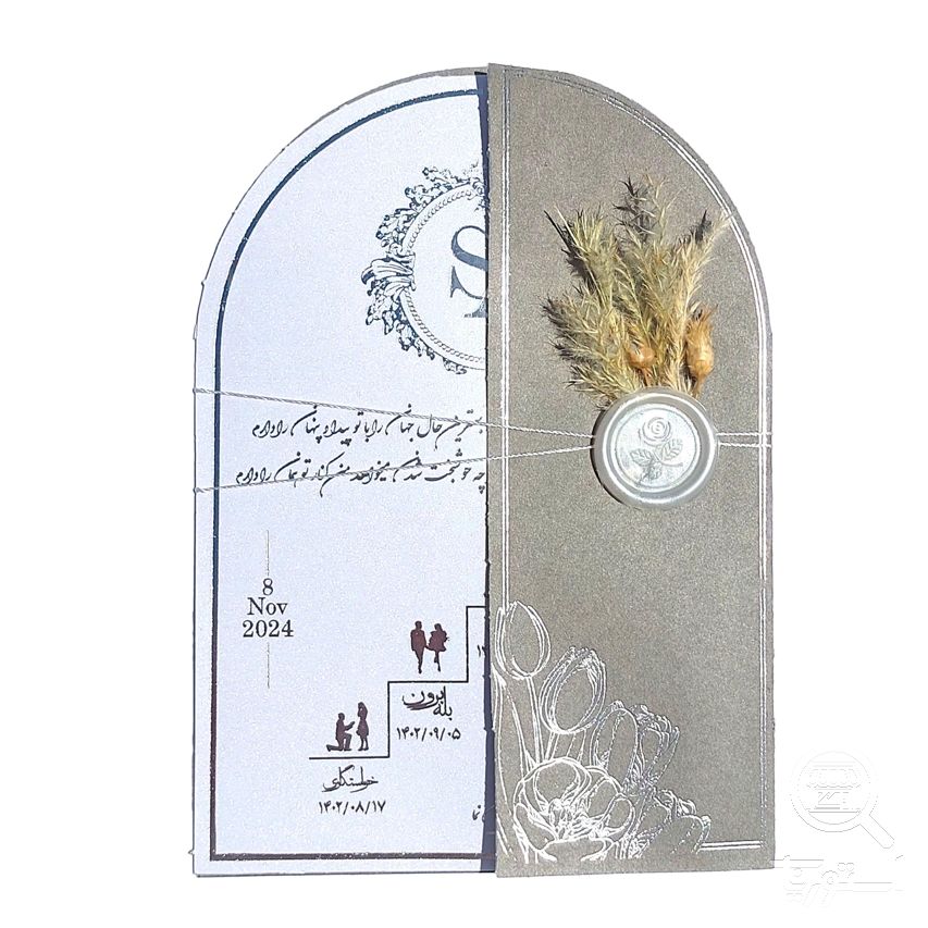 کارت عروسی مقوایی نقره ای دو تکه با گل خشک و مهر و موم 414