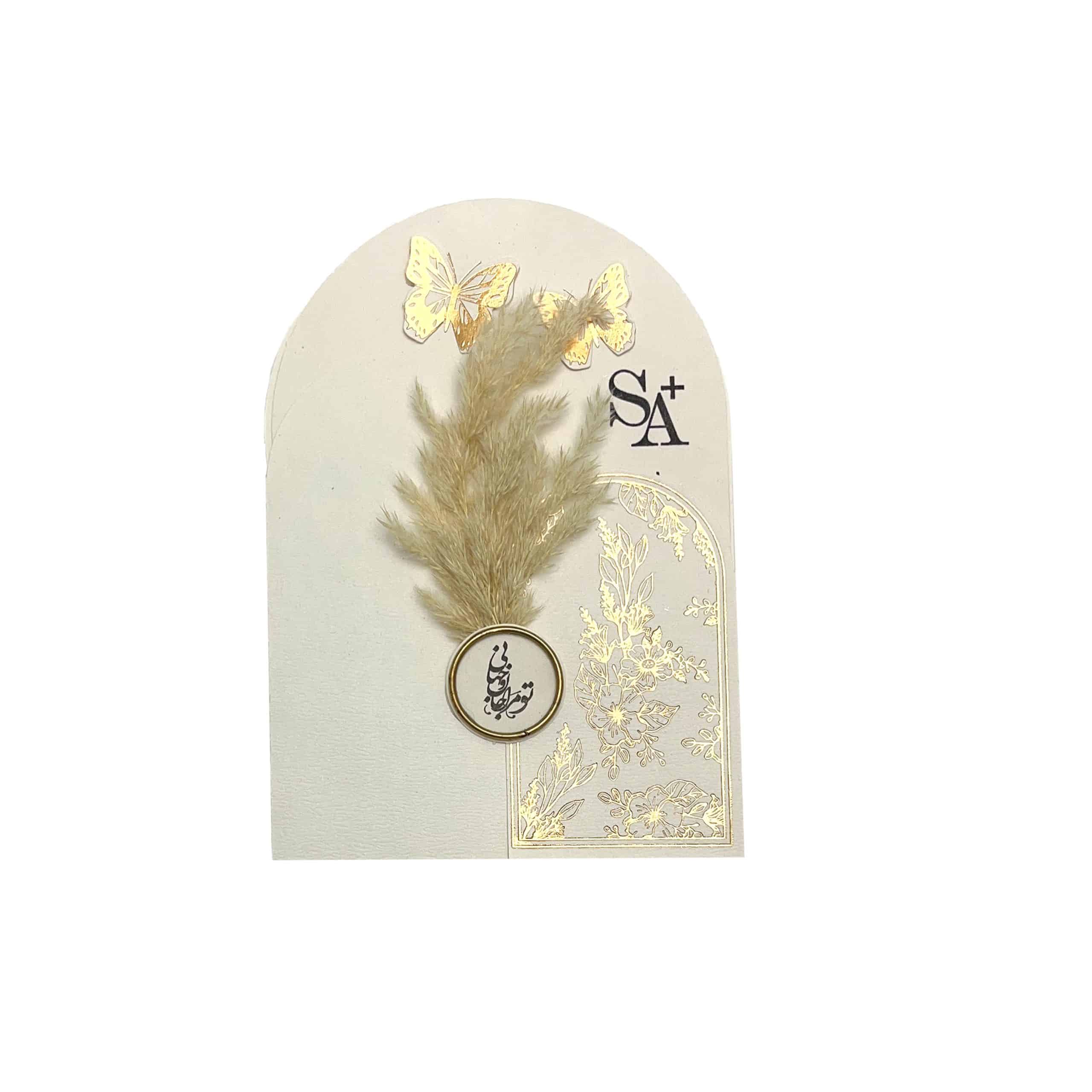 کارت عروسی کرمی بافت دار طاقی با پروانه و گل های طلاکوب 545